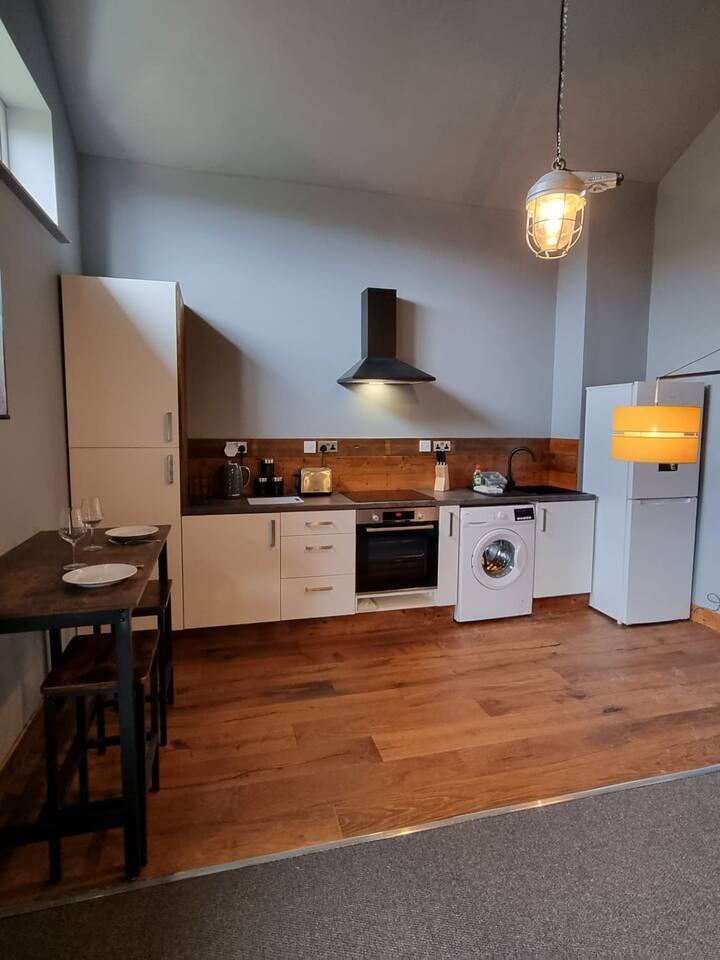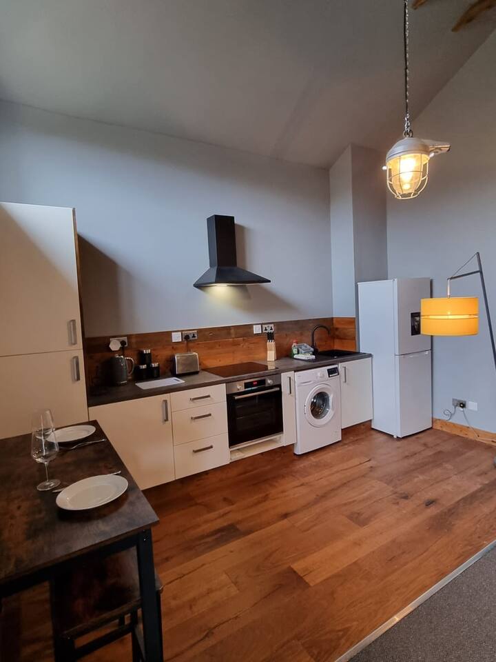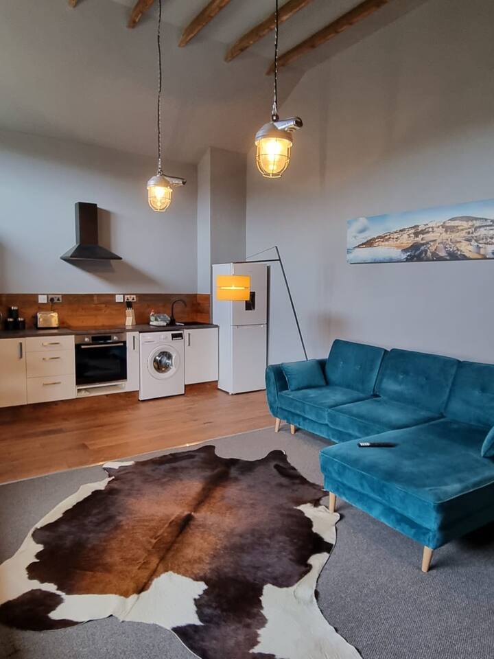 On Entering the Apartment you will find yourself in the impressive vaulted living/Dining/Kitchen space with feature exposed Brick and Timber clad walls and a fully fittted kitchen , leading through to the Bathroom and large double bedroom. On Entering the Apartment you will find yourself in the impressive vaulted living/Dining/Kitchen space with feature exposed Brick and Timber clad walls , leading through to the Bathroom and large double bedroom. 2 x Double Bedded Room. 1 x Double Sofa Bed in Living Room.
